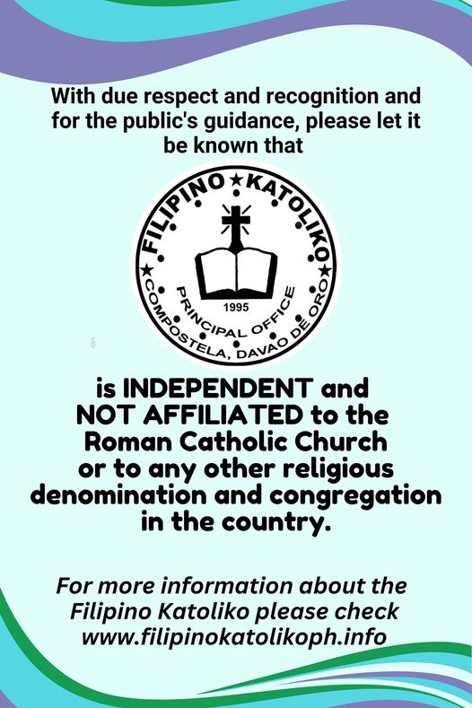 Aside from such inspiration, we cannot identify ourselves anymore to any Philippine or Roman Catholics or any religious sect in the country and the world. Ours as FILIPINO KATOLIKO is the name of our religious denomination and does not claim to represent the wide communities of Filipino Catholics.